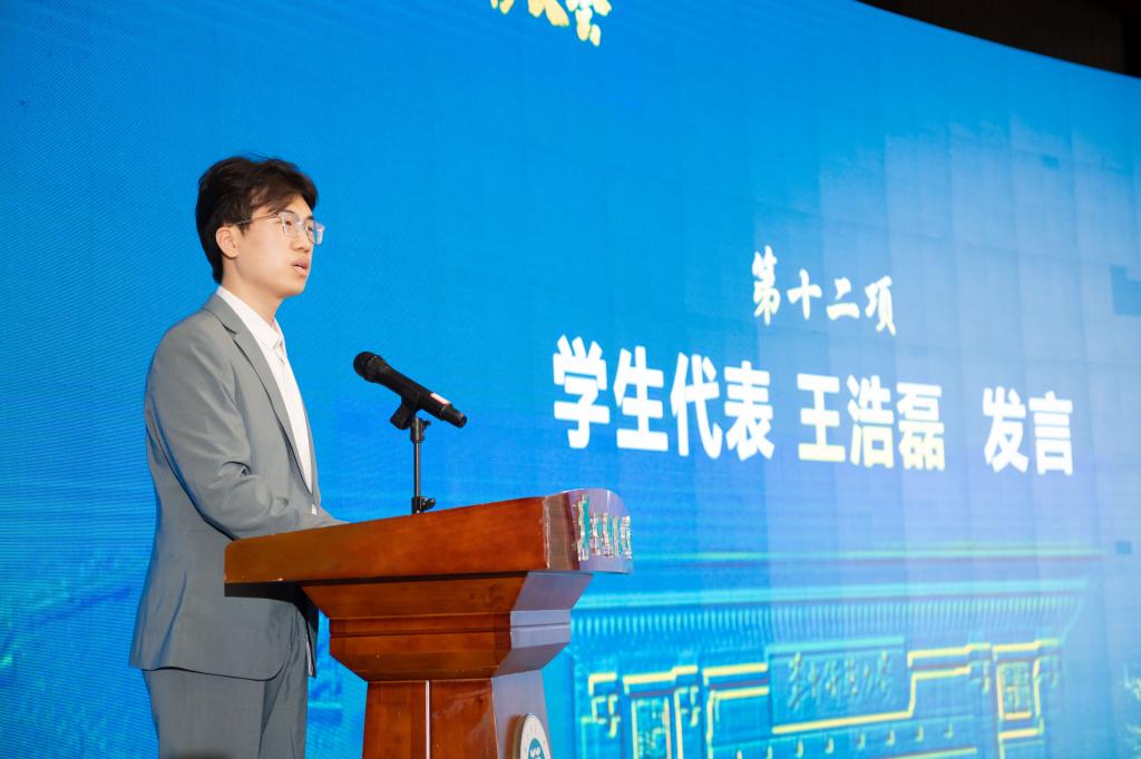学生代表、文学院王浩磊同学回顾了自己在华师的所见所闻所感,表达了自己对老师们的由衷感谢。他说,未来将继续刻苦学习、砥砺品格,怀抱对教育事业的满腔热情,坚定地站上祖国各地的讲台,在培养中华民族“梦之队”的进程中书写无悔青春。