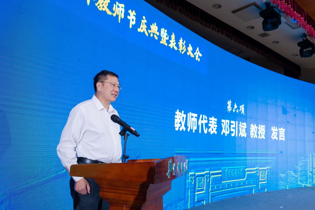 教职工代表、博雅学者、数统学院邓引斌教授回顾了自己在桂子山求学从教的人生经历,并表达了对学校与国家的感激之情。站在新的历史起点上,百廿华大坚定信心、昂首迈步,翻篇归零再出发,乘势而上再冲锋。今后将继续发扬科学家精神,勇闯自主创新无人区,敢啃关键技术硬骨头,为早日建成教师教育领先的世界一流大学而努力奋斗,做一名无愧于华师、无愧于时代的人民教师!