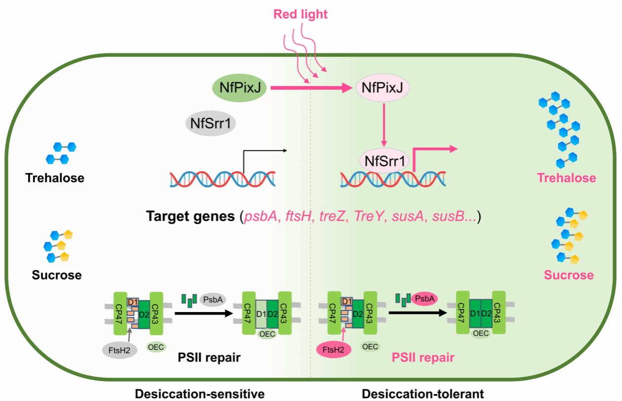 该研究发现,黎明时的红光可作为关键的“环境预警信号”,触发荒漠蓝藻为即将到来的干燥脱水提前做好准备。实验结果表明,在黎明红光刺激下,光合作用相关基因(如psbAs和ftsH2)显著上调表达,并受到转录因子NfSrr1的正向调控。同时,鉴定到红光感受器NfPixJ与NfSrr1形成信号模块,共同介导红光信号传导(图1)。进一步研究发现,NfPixJ-NfSrr1信号通路不仅调控光系统II的修复,还控制海藻糖和蔗糖等保护性兼容溶质的合成,帮助荒漠蓝藻细胞维持渗透平衡(图1)。这表明,红光作为一种全局性环境信号,在荒漠蓝藻耐干燥脱水中发挥核心调控作用。系统发育分析显示,该红光信号通路的存在与蓝藻适应干旱环境的能力密切相关,它可使蓝藻细胞在黎明时感受到红光信号,提前激活耐干燥脱水机制,为水分散失做好准备,确保在极端环境中更具生存优势。这一发现不仅为光诱导的胁迫耐受预适应机制提供了新的生物学视角,也拓展了我们对光合生物环境适应策略的认知,同时也为荒漠化治理以及光控生物技术提供了新的研究思路。