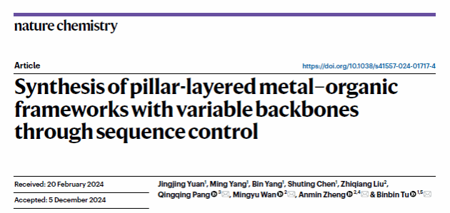华大在线讯(通讯员 周汉鸣)近日,化学学院涂斌斌副教授团队在金属有机框架序列调控方面取得了重要进展。该研究成果在国际化学领域权威期刊《自然化学》(Nature Chemistry)发表,题为“Synthesis of backbone variable pillar-layered metal–organic frameworks through sequence control”(Nat. Chem. 2025, 17, 421-428)。博士研究生元静静为论文第一作者,通讯作者为武汉科技大学庞青青讲师、万明宇特任教授、郑安民教授和第一足球网_188比分直播-官网涂斌斌副教授(最后通讯作者),第一完成单位为第一足球网_188比分直播-官网。