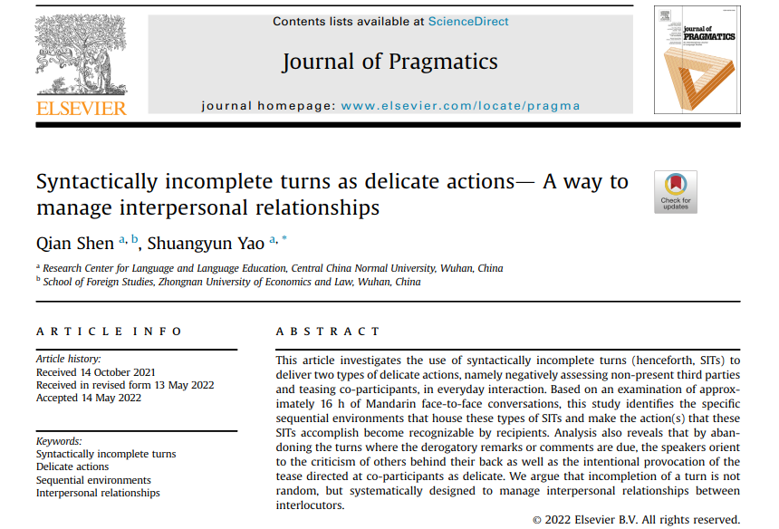 华大在线讯(通讯员 龚睿)近日,语言与语言教育研究中心姚双云教授及其团队在汉语口语语法研究中取得新的进展,在语用学国际知名期刊Journal of Pragmatics第197期上发表题为“Syntactically incomplete turns as delicate actions— A way to manage interpersonal relationships”的研究论文。该文为第一足球网_188比分直播-官网博士生沈谦和导师姚双云教授合作发表,是国家社科基金重点项目的阶段性成果,也是该团队第二次在该刊物发表重要成果。