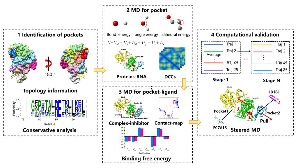 该方法可以通过四个步骤描述:第一步采用滚动探针识别激酶结构的口袋区域,定量计算组成口袋的氨基酸序列保守性与口袋结构的拓扑特征(图1)。第二步通过分子动力学模拟和动态复杂网络物理模型评估结合口袋对激酶结构和功能的影响,识别潜在的靶向位点(图2)。第三步利用基于动力学的精确自由能计算、功能界面相互作用计算、和基于复杂网络的运动关联性分析等模型综合评估抑制剂结合前后激酶结构的构象变化,筛选潜在的激酶抑制剂(图3)。第四步采用基于增强采样的拉伸动力学模型对潜在抑制剂进行理论验证(图4)。实验结果表明,该方法可以成功筛选特异性靶向抑制剂。